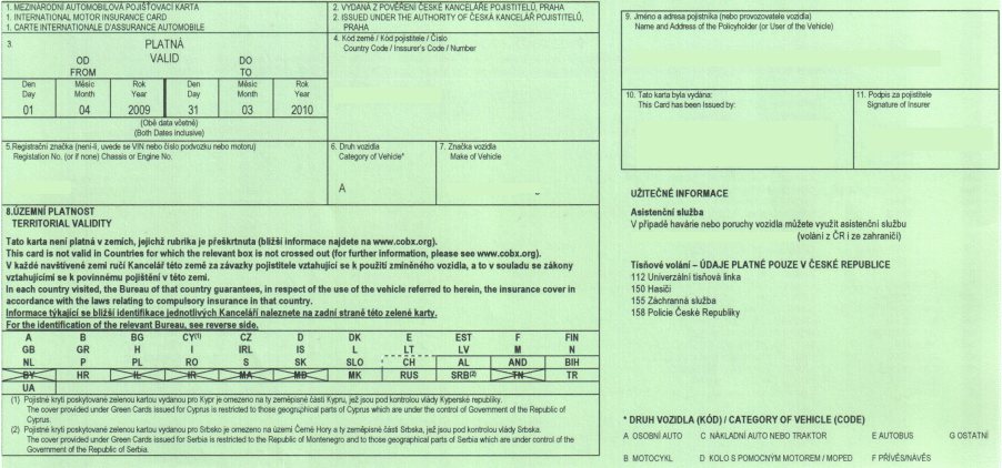 Zelená karta jako doklad o zákonném pojištění vozidla (povinném ručení).